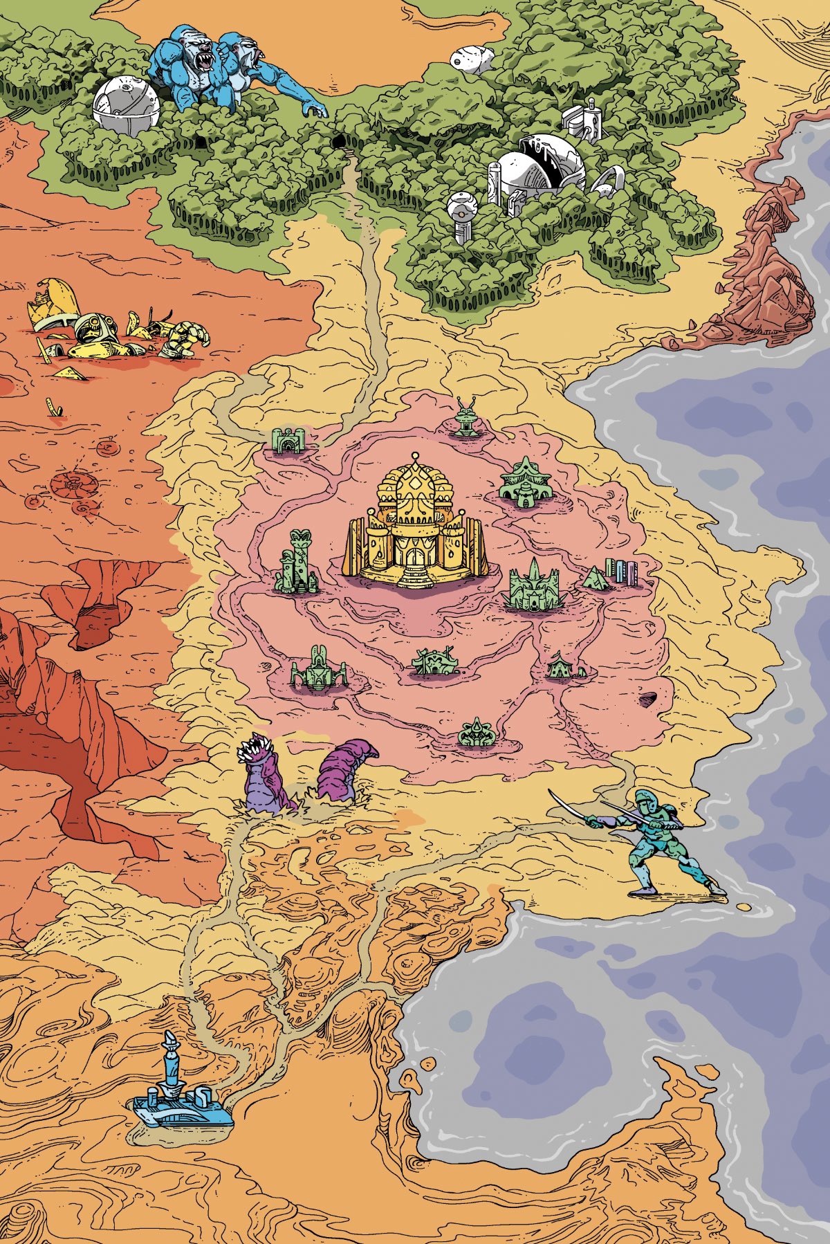 За этим анархическим пространством простираются Пустоши — земли, пронизанные всевозможными кочевыми группами и зверьём, живущим под песками, и все они склоняются перед червями, свободно рыскающими среди дюн. Алкаи, четырёхрукие жестянщики, выходят из дюн, чтобы продать изысканно обработанные товары или продолжить вековую войну с Всадниками дюн, что рассекают пески на своих изящных лодках.