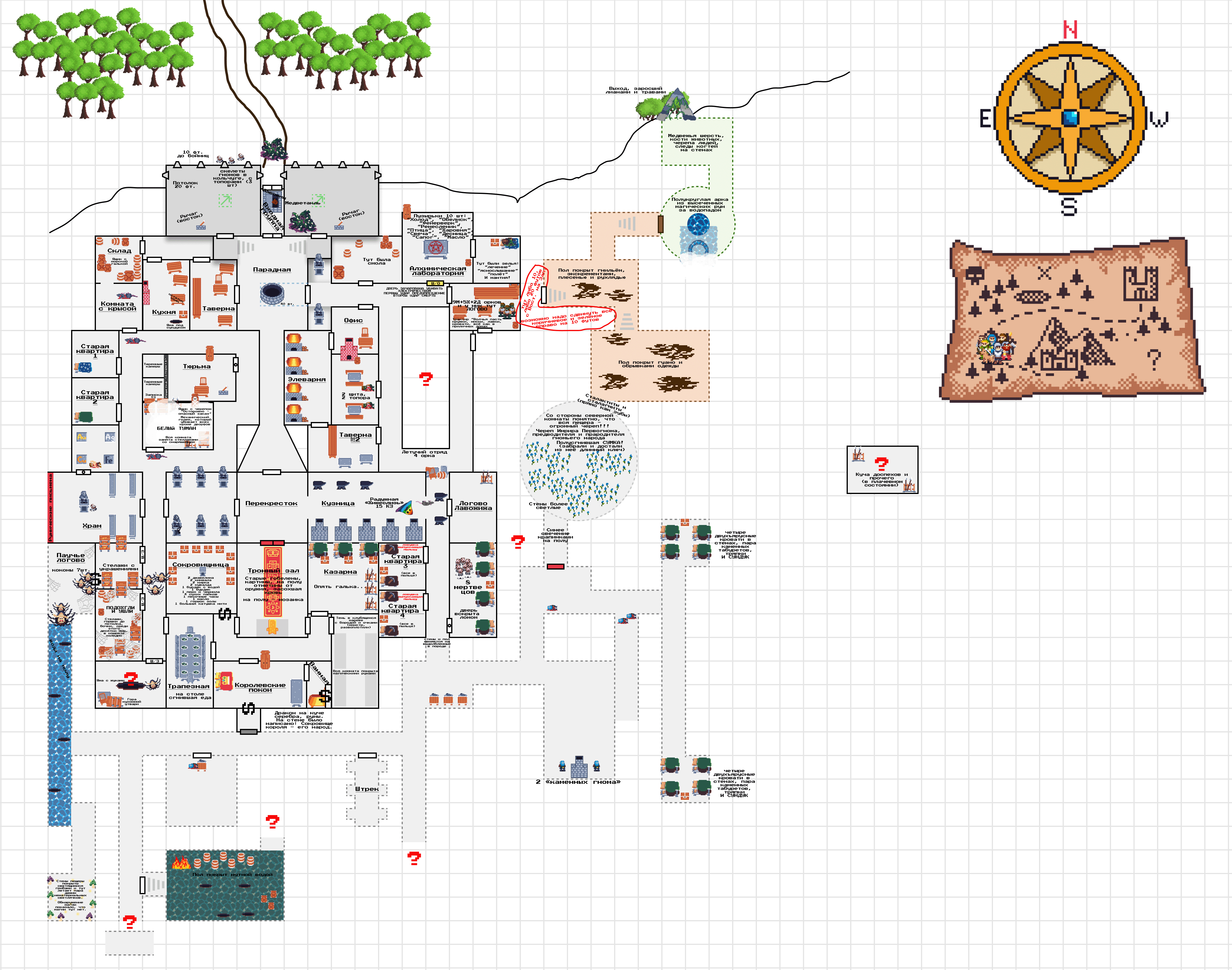 В это время основная часть партии попала в следующее помещение, представляющее из себя естественную пещеру, заваленную гнильем, экскрементами, плесенью и рухлядью. В западной части помещения короткая лестница вела к двери, и еще один выход виднелся в северной части.