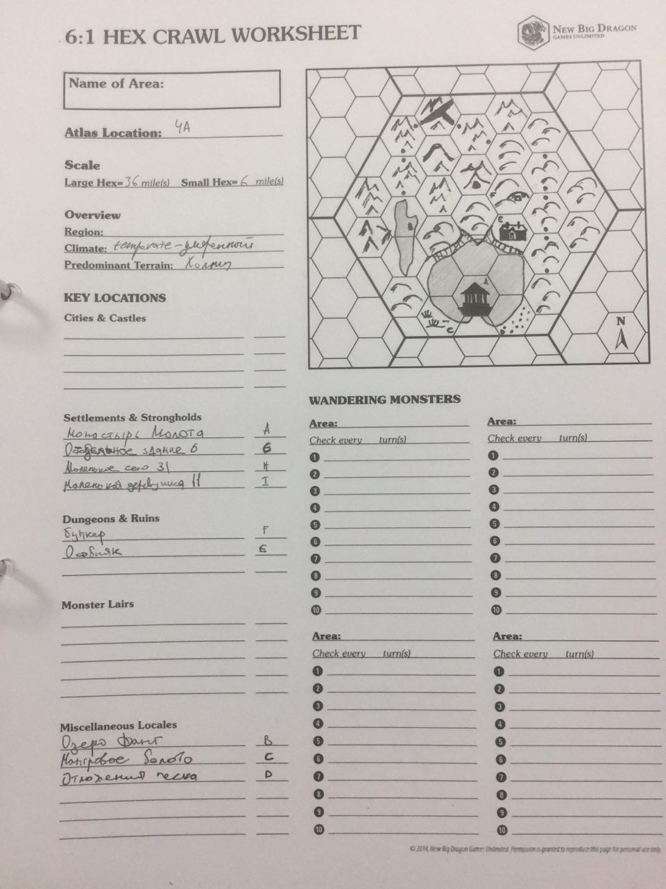 Зарекаюсь рисовать на работе - опять мазня от рабочей ручки. На этом моменте я вспоминаю, что надо бы еще поселения разместить. Вероятно, перерисовки всего листа не избежать. Впрочем, можно установить в гексы литеры и в пояснениях слева расписать деревни, но меня начинает раздражать эта непоследовательность (см. фото другого атлас-гекса, где даже малюсенькое село на 11 человек занимает весь гекс).