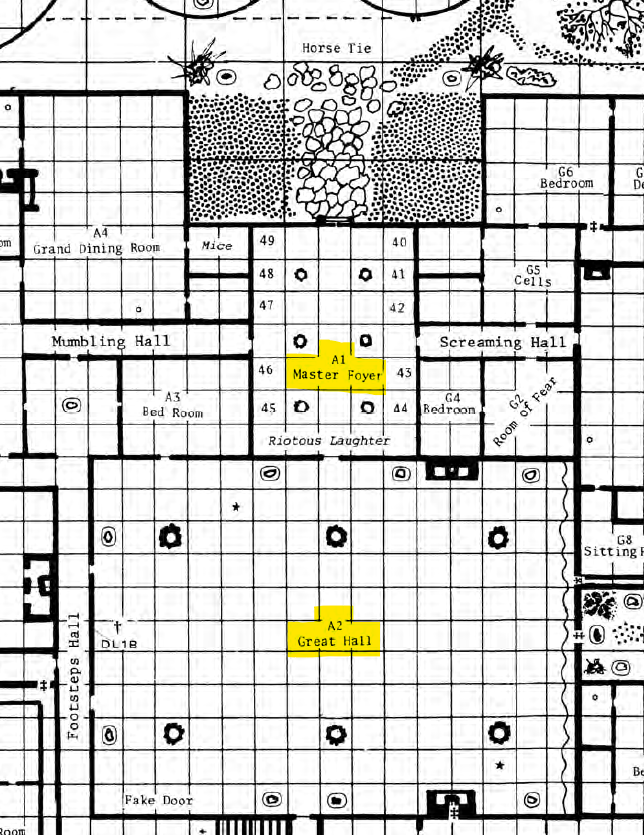 A1 — ГЛАВНОЕ ФОЙЕ (50’x70’x40’H): огромное помещение, которое встречает персонажей, оказывается холодным и мрачным, его полумрак едва разгоняют жаровни, расположенные вдоль стены через каждые 20 футов. Двойные ряды колонн, похожие на огромные каменные деревья, уходят в темноту над головой. Вдоль стен висят семейные портреты. Боковые проходы слева и справа ведут в Кричащий зал (в комнаты G) и Бормочущий зал (ведущий в секцию A).