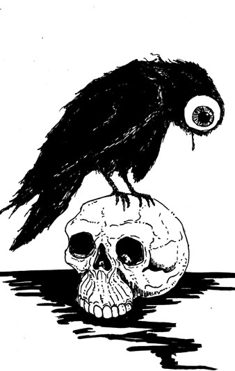 В этот момент с севера слышатся порхания крыльев, и в зал влетают четыре комка вороньих перьев, каждый отливающий свои цветом. Нет ни клювов, ни лап, лишь один огромный глаз, который грозно зыркает на всех в комнате.