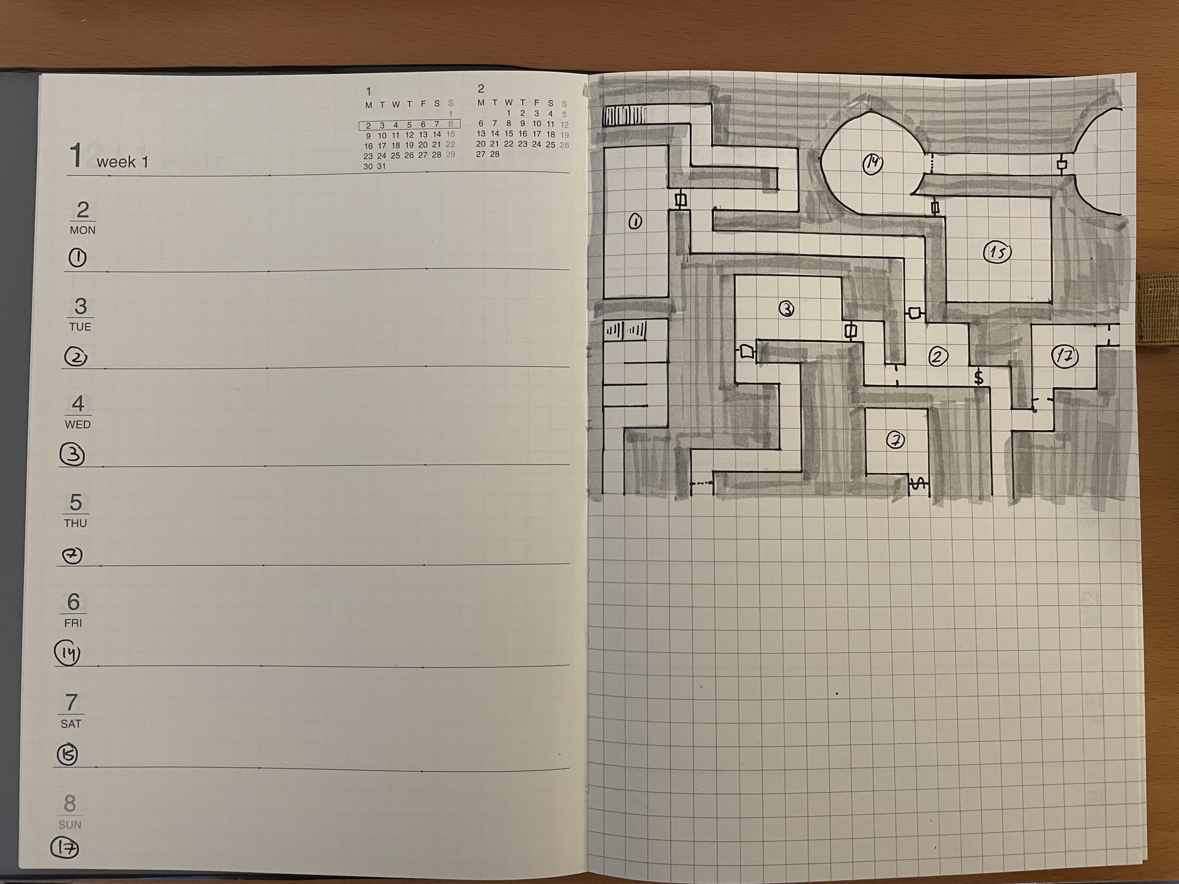 Как только дошёл до рисования карты континента, я застрял. Стоит посмотреть на любую чужую карту и свою уже хочется выкинуть. Попытался бороться с этим, в итоге только неделю спустя что-то сделал. Врубилась прокрастинация, делал работу (ту, что обычная работа за зарплату) наперёд, чтобы не делать ничего для игры… Решил пока не заниматься миром и сеттингом, а выбрал (броском к4) тему первого данжа (гробница “лича”) и решил пилить её. Накидал в https://donjon.bin.sh/fantasy/dungeon/ карту, разметил в пэинте области по неделям, переделал нумерацию (в оригинале она… кривоватая). Как можно увидеть, с картой я налажал слегка, а потом ещё раз =)