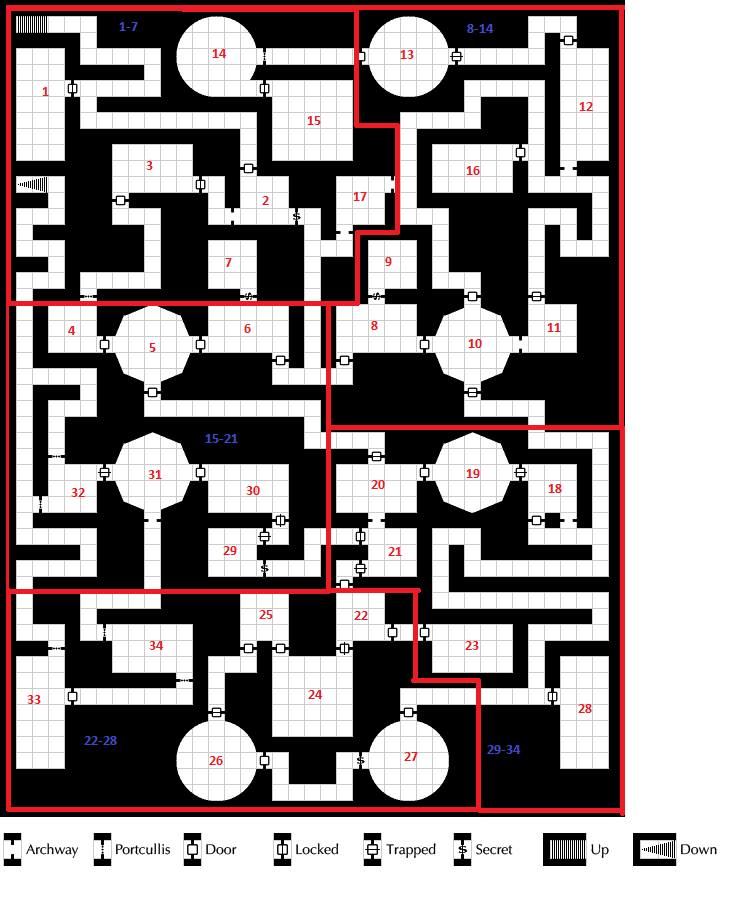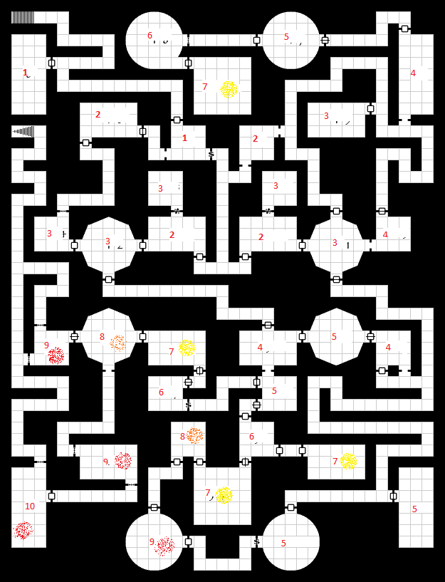 Решил я стокать +/- всё по 7VoZ, так что накидав для 1-го уровня таблицу случаек на 12 пунктов, окинул всё это взглядом и выбрал 6 (где-то в рулзах написано, что правила по данжам там предполагают 50–100 комнат, а у меня-то 34). В 6 этих случайках две будут с одиночными монстрами, коих потом предлагается из таблицы убрать. Итого, смотря на зоны с картинки выше: