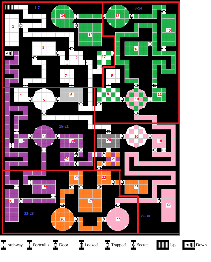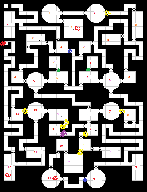 Ну и наконец переход в левую нижнюю часть карты скрыт полностью за одним секретным проходам и должен открыться, если карта будет вестить хорошо и большая часть подземелья будет уже нарисована — фиолетовый кружок. В этом же месте на одинаковой глубине 12 находятся переходы на нижний уровень и прямоугольная зала для чего-то крутого и/или мощного.